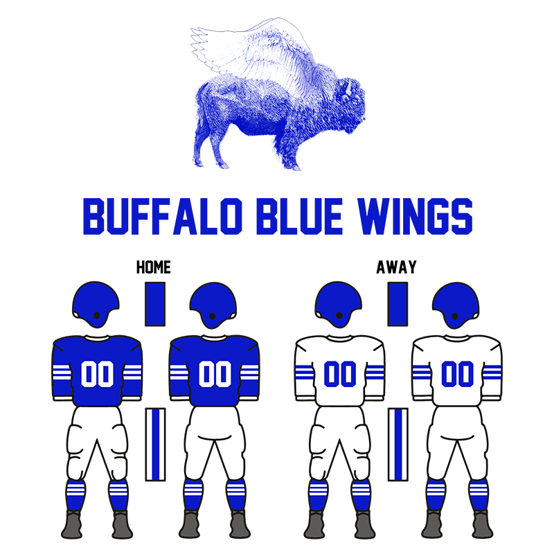 For the Blue Wings logo I just wanted to be a little goofy but give a feel for older sketched logos and in this case how about a buffalo with wings. This has been the team's mascot for the last couple of decades. Jerseys are very simple, but I wanted to have a Detriot Red Wings/Toronto Maple Leafs feel of classic colour and white combo.