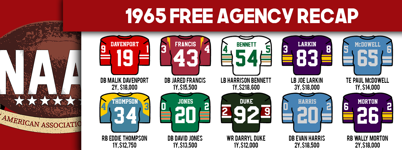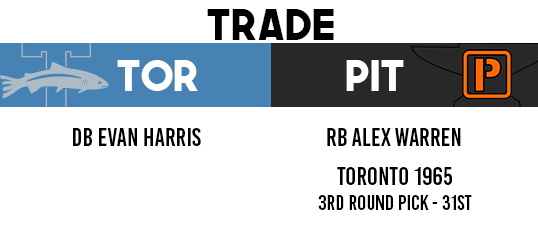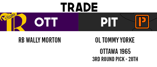 The Blacksmiths did not make any signings, however, they did make a pair of trades to clear out a couple of their expansion-tagged players. The first was DB Evan Harris who was shipped back to Toronto in exchange for Toronto’s 3rd round pick in 1965 and RB Alex Warren. Warren was not happy with the lack of snaps he got last season in Toronto and will be excited for the opportunity with Pittsburgh. With Warren coming in, the Blacksmiths then send their own tagged RB, Wally Morton, to the Royals (the team that originally drafted him), in exchange for Ottawa’s 3rd rounder and OL Tommy Yorke. Both tagged players would sign contracts with their new teams.