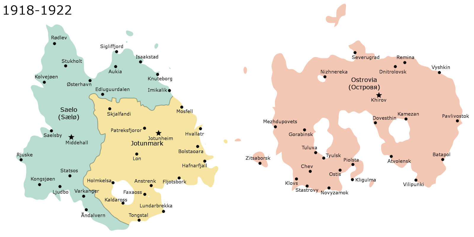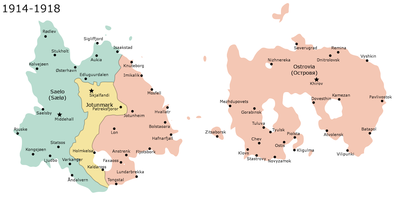 World War I was a particularly hard time for the people of the islands of Ostrovia with the Kingdom of Ostrovia aligning with the Central Powers and Jotunmark and Saelo with the Allies. Ostrovian King Vsevolod IX ordered his military to invade Jotunmark and Saelo, and at first they made quite a few gains until stalling out in trench warfare. During this time, the capital city of Jotunheim was captured, so the Jotunnish moved their government safely back to Skjalfandi temporarily. Fighting was especially tough in the region of Suðrimark (now Southmark) in Southern Jotunheim where the mostly Jewish troops of the area fought gallantly to slowly beat back the Ostrovians. At the end of the war, the Ostrovians were pushed back to their island and forced to pay reparations. King Vsevolod IX was executed and the nation transitioned from an absolute monarchy to a constitutional monarchy with the new King Vladimir III more of a ceremonial figurehead than any real power.