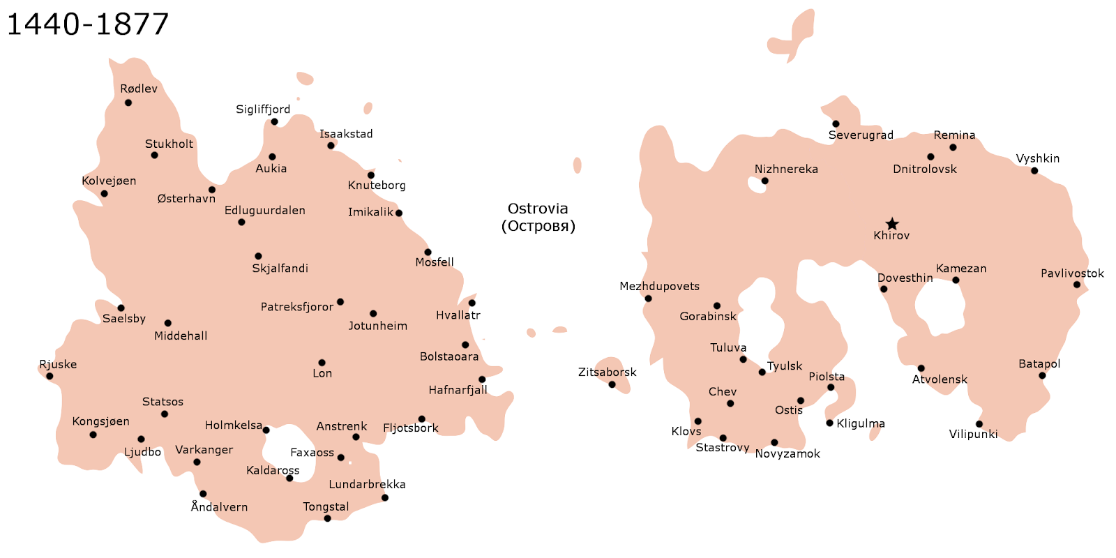 Despite the island of Saelo having a more Nordic culture, the islands were united in 1440 as the Kingdom of Ostrovia under King Vsevolod I the Great. A great capital city was built in the ruins of an older Slavic settlement and was named Khirov. The official religion of the Kingdom was Russian Orthodox until 1610 when the Ostrovian Orthodox Church broke off. Throughout the sixteenth and seventeenth centuries, a first large wave of Jewish immigrants were welcomed in large numbers from Europe and they settled mainly in Southern Saelo as well as a small area in Southwestern Ostrovia.