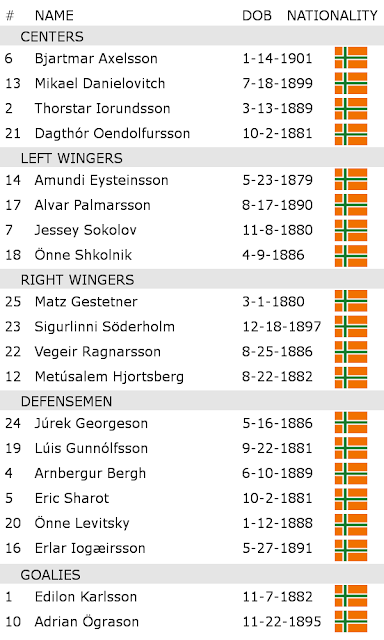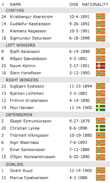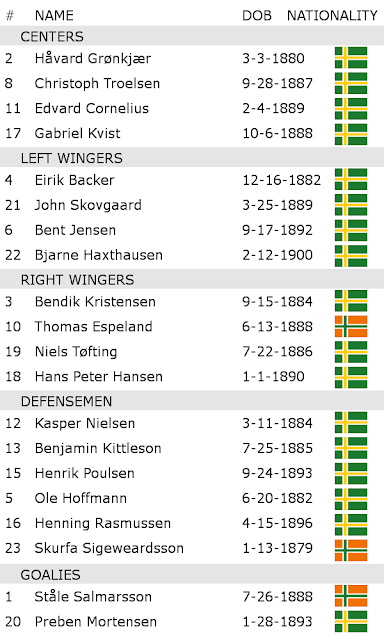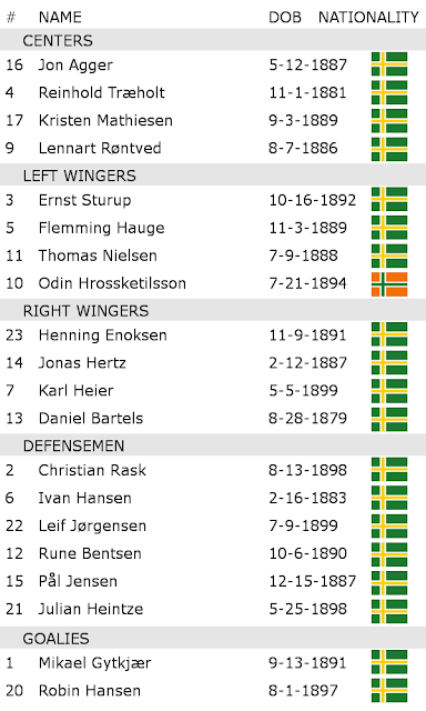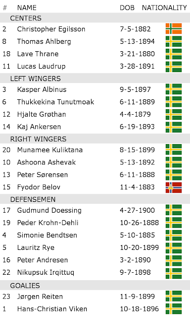 Representing the port city of Østerhavn, the Østerhavn Skibsbygger (Shipwrights) took advantage of a talented roster and outworked their opponents to finish first with an impressive 19-3-2 record. Goalie Holger Rohde was seemingly unbeatable in net for the Skibsbygger earning league MVP status. The club's scoring was led by Lone Zohore who missed the scoring title by only 3 points. Young defenseman Aage Kahlenberg, who was a huge player for the time at 6'3" and 205lbs, overpowered the league's top offensive stars helping clear the way for Rohde to make easier saves.