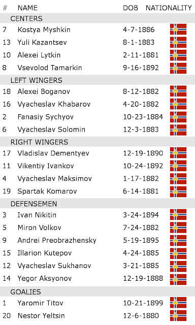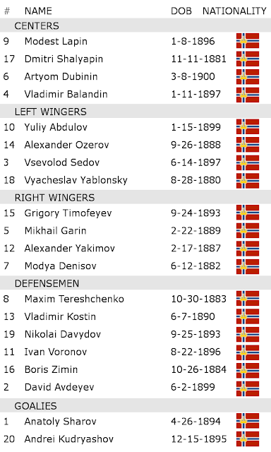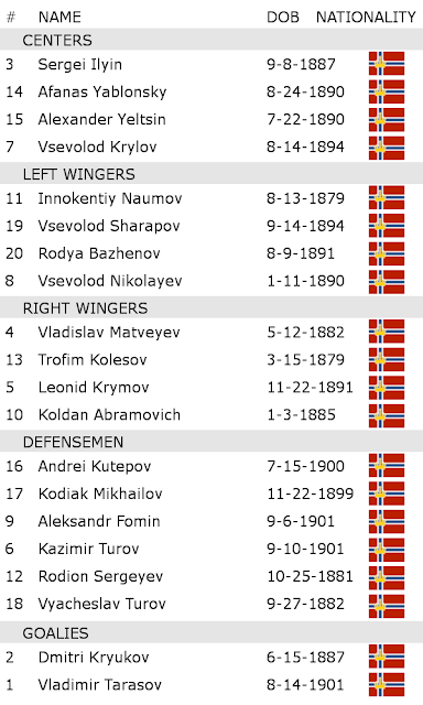 Representing the capital, Koroli Khirov (Khirov Royals) finished first in the 1919-20 campaign with a respectable record of 15-9. Khirov was led in scoring by winger Grigory Timofoeyev and his linemates Modest Lapin and Yuliy Abdulov. Goalie Anatoly Sharov got the majority of starts with Andrei Kudryashov only getting into a few games. Defenseman and captain Maxim Tereschenko was excellent in both ends earning himself the league MVP honors.