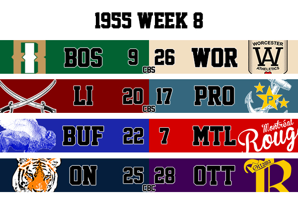 Boston Independents - 9, Worcester Athletics - 26 - Richardson Stadium - September 3, 1955 - 1 PM ET - CBS