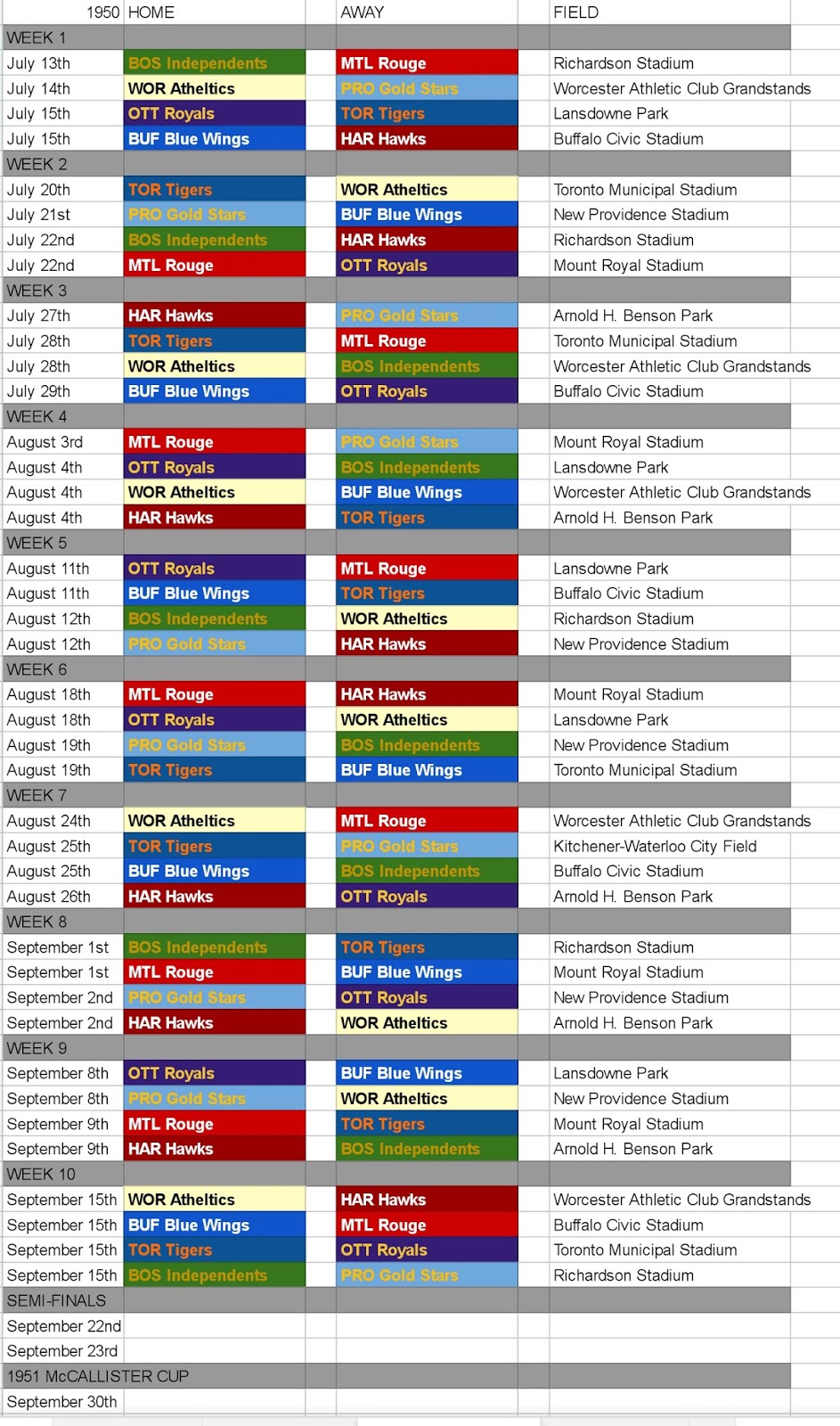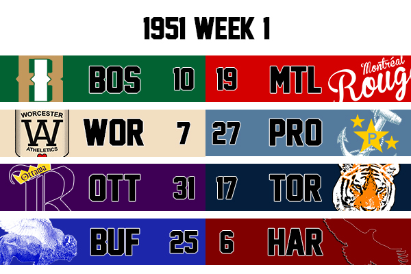 The schedule for the 1951 season was released prior to the free agency opening up. The season remains at 10 weeks as mentioned before but every team plays throughout the whole season with no breaks. The biggest issue was Toronto was unable to get a 5th home game in the deal with the Toronto Municipal Stadium and they took the opportunity to schedule a game in Kitchener. The game will be played at the Kitchener-Waterloo City Field which holds 23,945 seats. This could be an opportunity for the Tigers to expand their reach out of Toronto where they are still not as popular as the Lakers. The game will happen in week 7 against Providence.